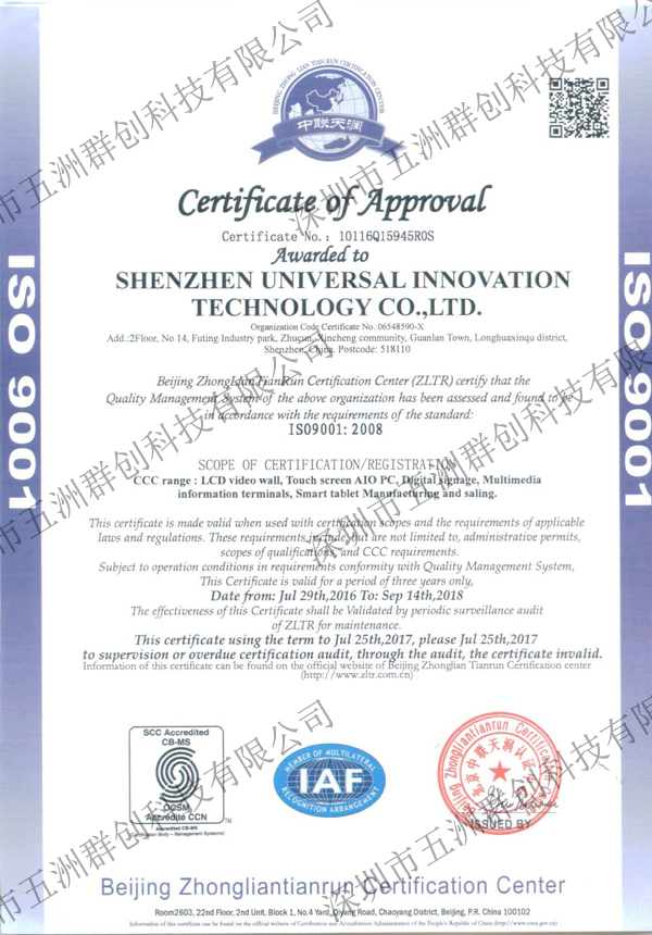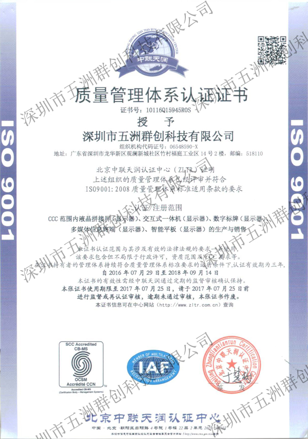 五洲群創(chuàng)通過ISO9001:2008質量管理體系認證,不僅是對企業(yè)實力的一種認可,也是對消費者負責的一種表現,公司自建立質量體系以來,全體員工在“持續(xù)改進”原則指引下,把產品質量放在第一位,形成了按質量體系要求工作的好習慣,同時公司完善了很多規(guī)章制度和工作程序,建立了持續(xù)改進的有效機制。公司的管理水平和產品質量得到了不斷的提高,有利地促進了公司各項工作的開展,成效明顯。