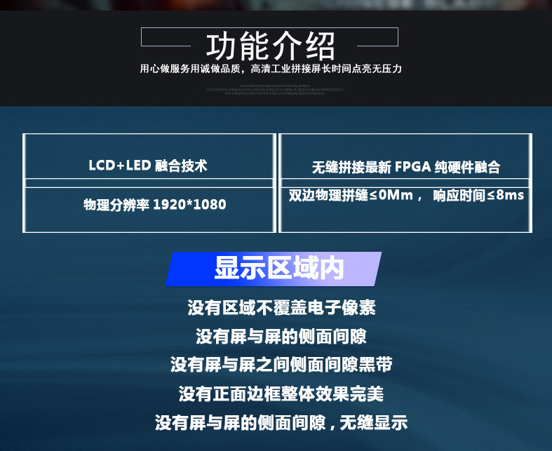 相對于其他同類大屏幕商顯產品,無縫液晶拼接屏在功能和性價比上也是比較突出的,其擁有拼接屏的全部特性,在室內近距離觀看不會模糊、分屏、整屏顯示,支持7*24小時不間斷運行。