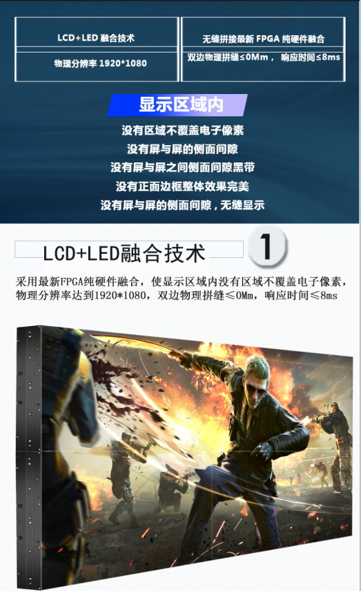 ◆55英寸拼接單元所采用使用LCD+LED融合技術,采用最新FPGA純硬件融合,使顯示區域內沒有區域不覆蓋電子像素