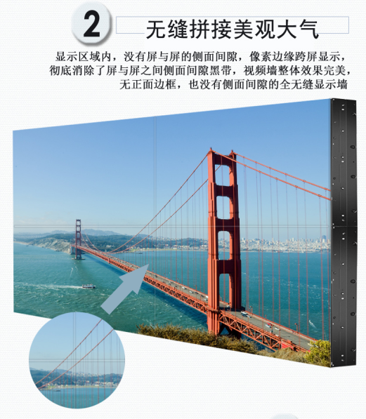 ◆顯示區域內,沒有屏與屏的側面間隙,像素邊緣跨屏顯示,徹底消除了屏與屏之間側面間隙黑帶,視頻墻整體效果完美,無正面邊框,也沒有側面間隙的全無縫顯示墻。
