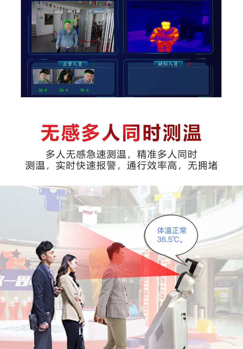 可以同時監測大范圍人群,同一時刻最多支持20人測溫,毫秒級響應,快速找出人群中體溫較高的并對其進行紅色標記,實時傳輸到管理平臺。