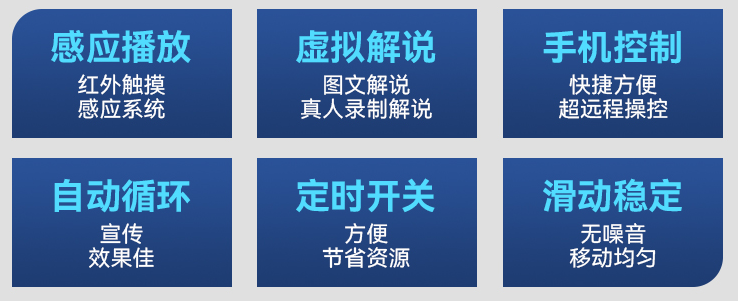 系統由一體機、滑軌套件、節點感應播放程序、背景展板等部件組成能夠實現推動前端的一體機顯示屏,滑到某個節點,一體機顯示屏播放相應的內容,可以是圖片、文字、視頻等,同時也可以加入觸控功能