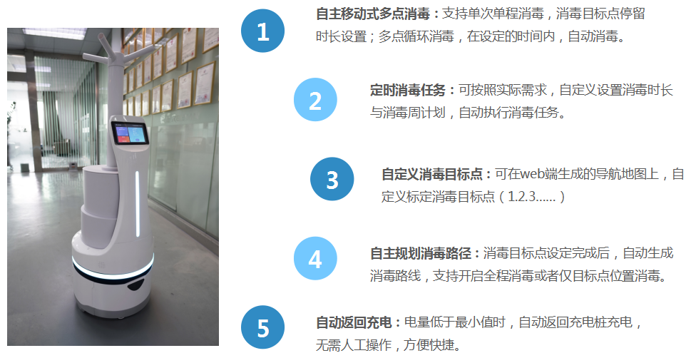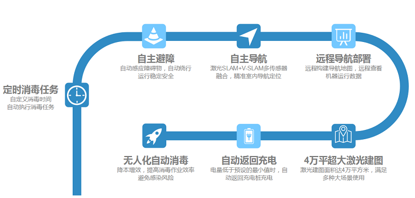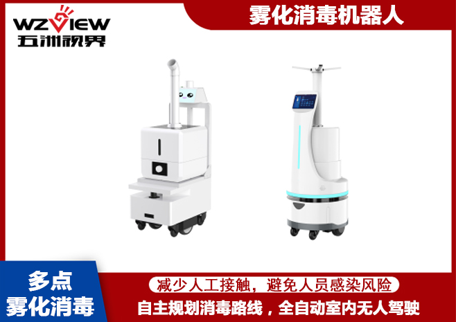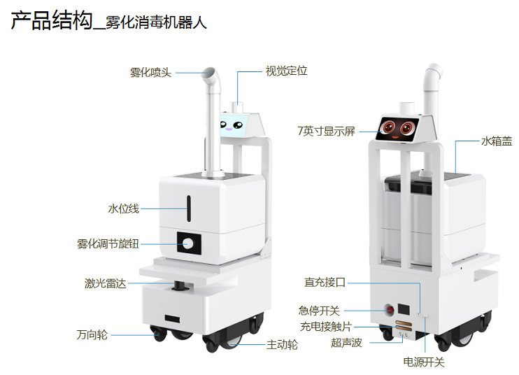 霧化消毒機器人,以機器人為載體,自主移動式多點自主消毒。通過稀釋消毒液并進行霧化,消毒液經過霧化后形成微小的顆粒,有效抑制附著在物體表面上的微生物、細菌、病毒,按照實際消毒需求,自主規劃消毒路線,全自動室內無人駕駛,可對室內空間物表和空氣進行360°無死角消毒,15分鐘可消毒1000m3空間,減少人工接觸,避免人員感染風險。